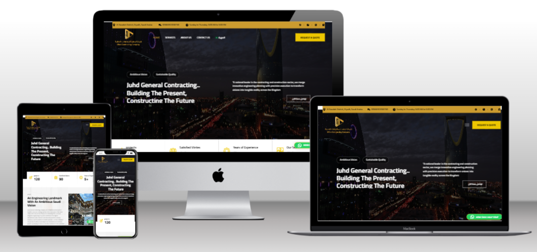 قمنا بتنفيذ تصميم وبرمجة موقع إلكتروني احترافي لشركة جهد للمقاولات العامة بالرياض، بهدف إبراز قوة الشركة في قطاع المقاولات والإنشاءات وتعزيز حضورها الرقمي، مع تقديم تجربة مستخدم سهلة وتصميم يعكس الاحترافية والموثوقية في المجال الهندسي.